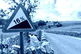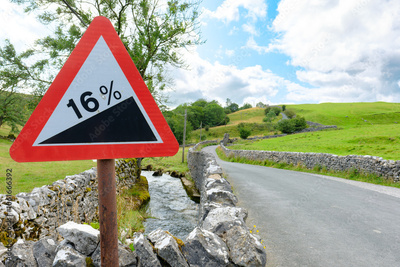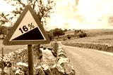 Steep 16% hill gradient sign seen at the beginning of a steep hill in the beautiful Yorkshire Dales, England.