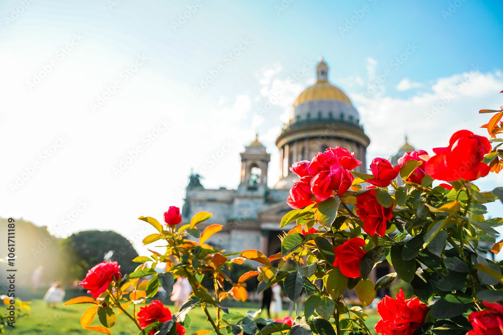 Beautiful urban landscape in summer St. Isaac's Cathedral in St. Petersburg, a field of flowers.