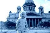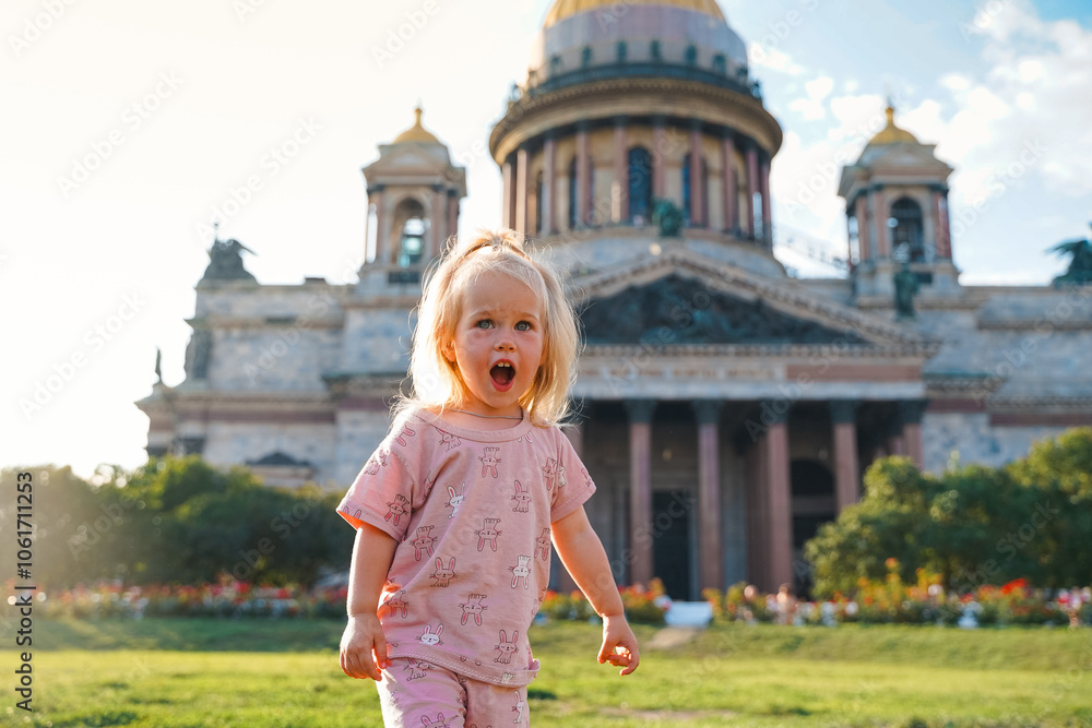 Cute little child girl travels with her family in the summer at St. Isaac's Cathedral in St. Petersburg, active childhood.