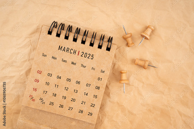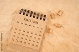March 2025 desk calendar with wooden thumbtack on brown crumpled paper background.
