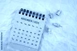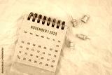 November 2025 desk calendar with wooden thumbtack on brown crumpled paper background.