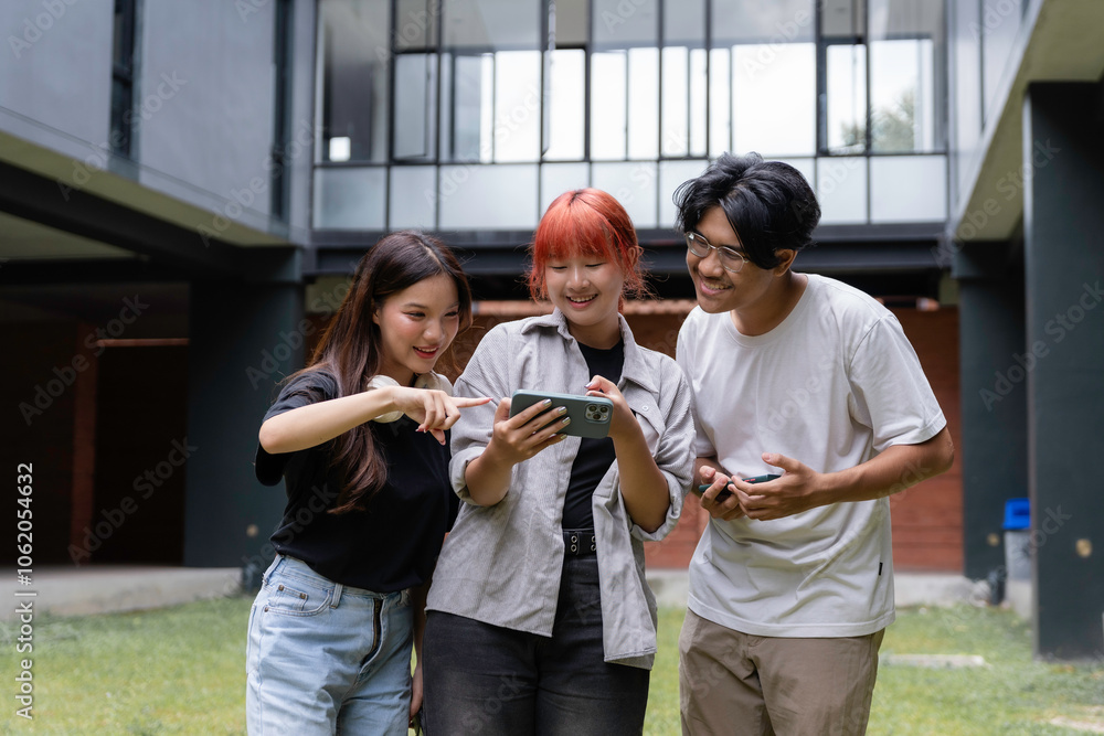 Group of young asian students looking and pointing at smartphone, enjoying break time together at university campus