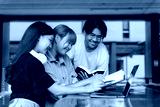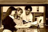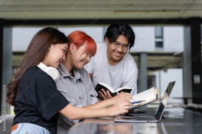 Group of happy asian students researching and learning together using laptop and books in university campus
