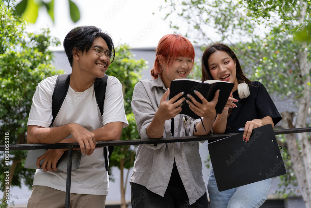Group of cheerful students reading a book together, enjoying their time at university