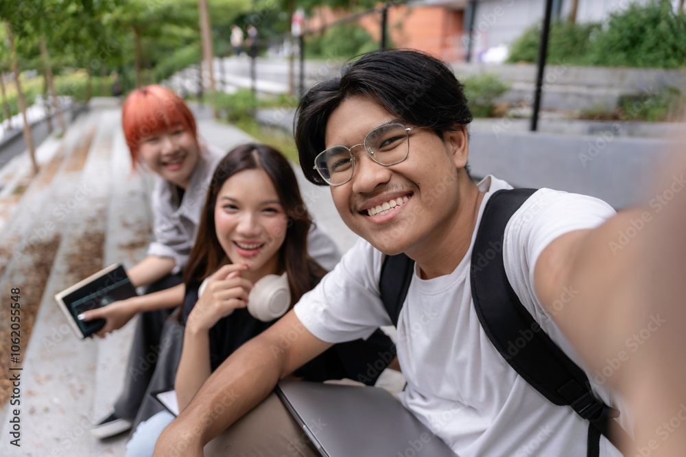 Diverse students capture joyful moment with selfie on college campus, bonding over shared experiences in educational journey