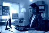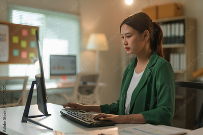 Young professional woman typing on keyboard, concentrating on her tasks in a modern office environment