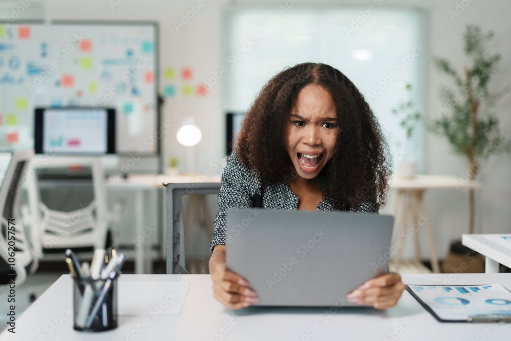 Stressed businesswoman screaming at her laptop while working in the office, experiencing work burnout and frustration