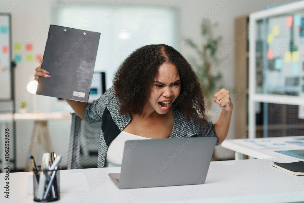 Stressed businesswoman getting angry and yelling at her laptop while holding a folder in her office