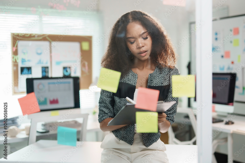 Young professional woman working with sticky notes and clipboard, analyzing charts and data in a bright modern office
