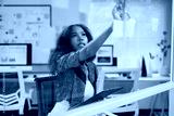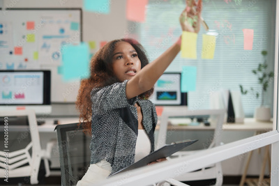 Young project manager attaching sticky notes on a glass wall while planning a new strategy in a meeting room