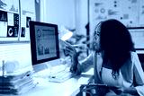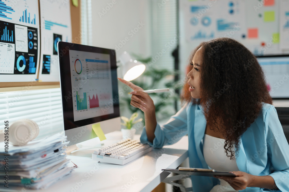 Young woman pointing at computer screen displaying marketing data, holding a clipboard and discussing strategy in a bright office