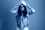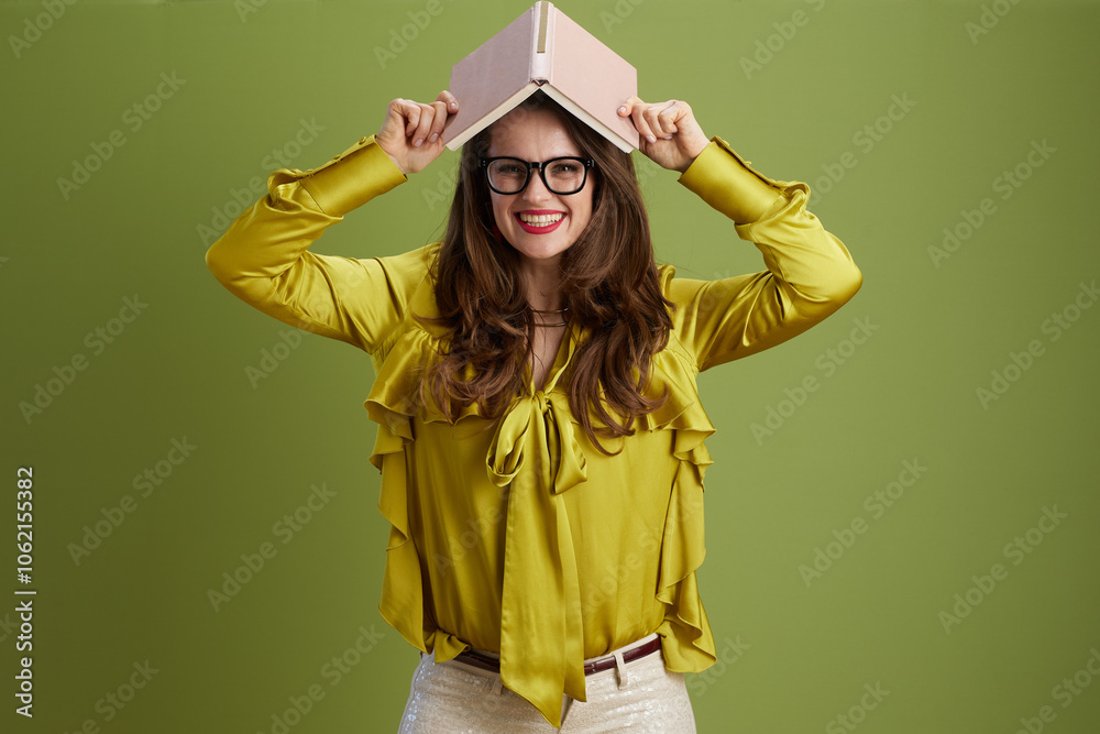 smiling trendy woman in green blouse and glasses against green