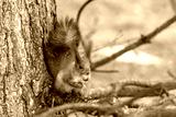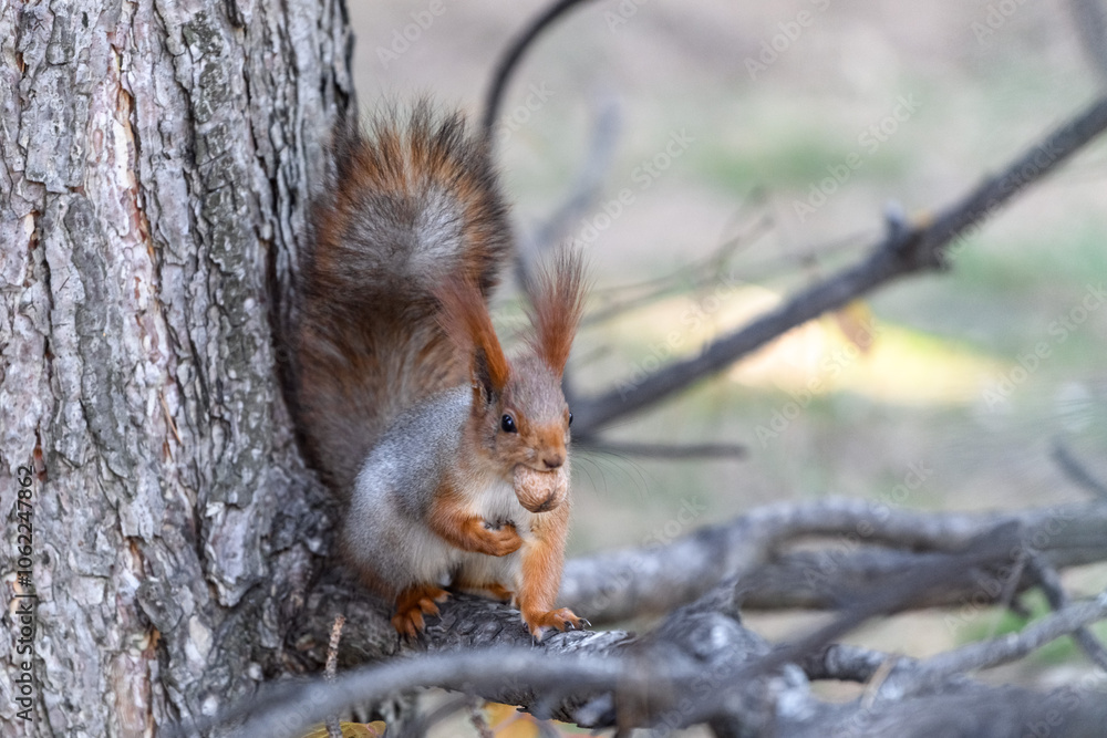 Red eurasian squirrel in autumn park