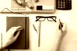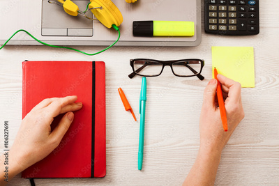 Businesswoman working at office desk with paperwork and other objects around, top view