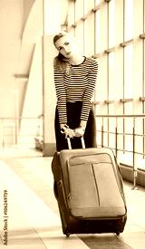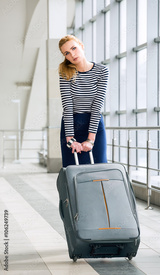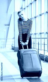 young blonde woman pulling heavy suitcase on the station was going on a trip. It is difficult to carry luggage. Tired