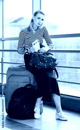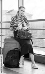 young blond woman sat on suitcase, holding a map, a backpack, was going on a trip.