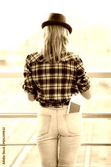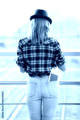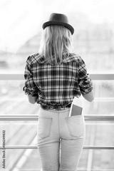 young woman in a hat and turned his back is against the background of glass wall. pocket a passport and a ticket
