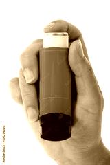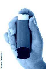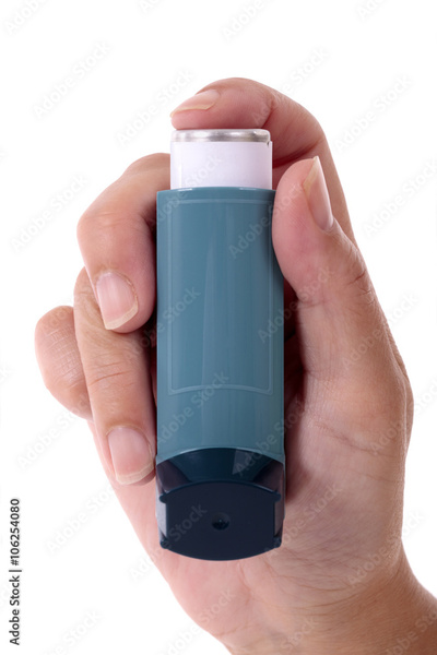 Asthma ventolin salbutamol inhaler held in hand isolated on white background photo