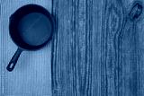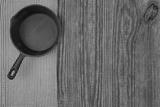 Empty pan on wooden deck table with tablecloth. Flat mock up for