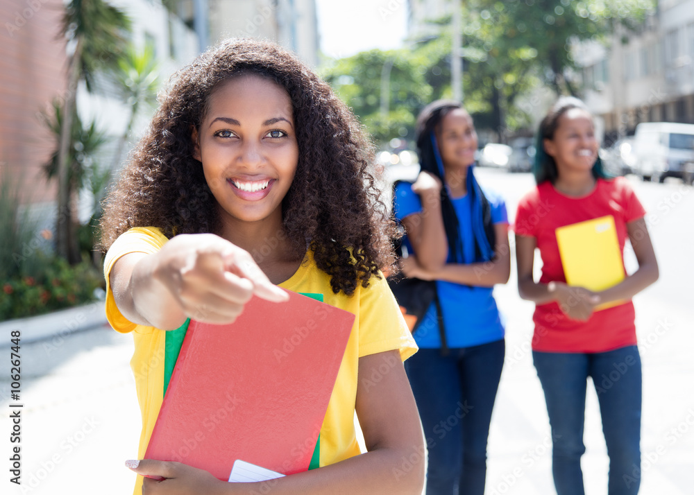 Mexikanische Studentin mit Freundinnen zeigt zur Kamera