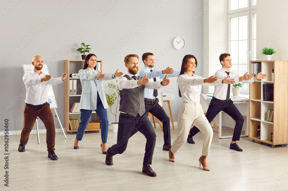 Full length portrait of young funny business people doing corporate exercises standing at workplace in office. Team of smiling company employees exercising for health during a break from a work.