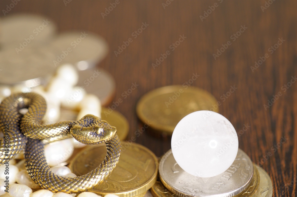 A snake statuette with coins and a quartz ball. Financial horoscope.