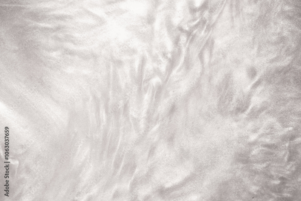 Shimmering silver abstract background. Liquid glitter paint texture waves and swirls. Beautiful shiny white glitter texture. Metallic silver paint close-up as a holiday background.