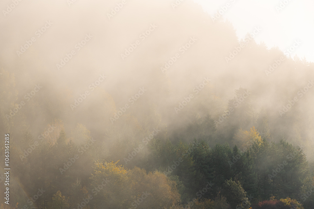 Atmospheric Fall Landscape with Fog Rolling Through Moody Trees