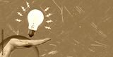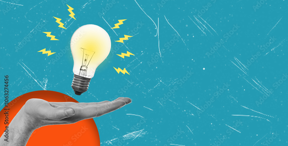 Modern art collage featuring a hand with a light bulb and a space copy space on a blue background.