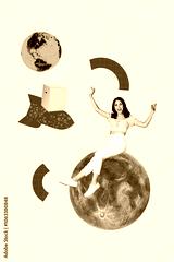 Composite trend artwork 3D sketch image photo collage of young woman sit moon planet earth racket delivery fly box service worldwide