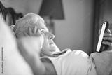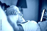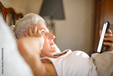 Senior woman at home lying on bed under duvet at bedroom using cellphone