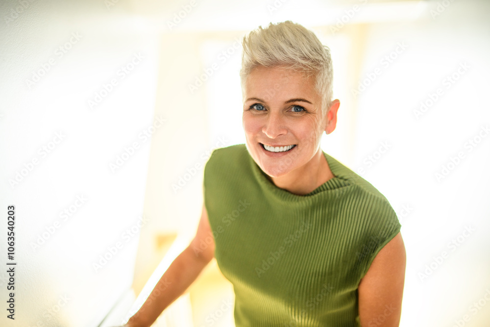 Mature woman on top of stairs at home showing big smile