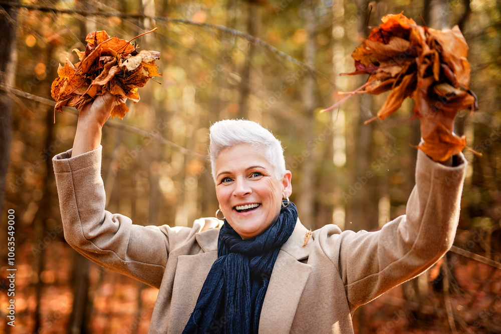 Mature woman in autumn forest, dressed in cozy fall attire, Reflection and connection with nature, wellness