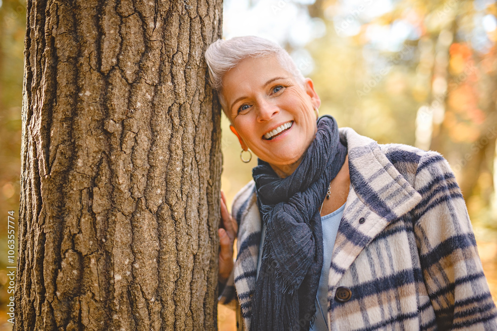 Mature woman in autumn forest, dressed in cozy fall attire, Reflection and connection with nature, wellness