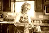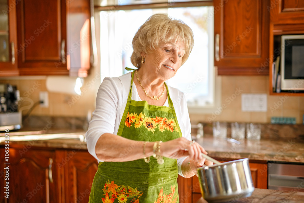 Happy senior woman preparing lunch in modern kitchen cooking for the family at home