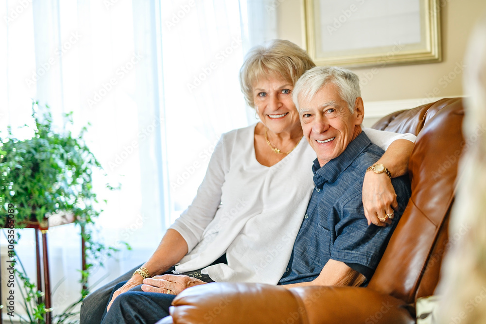 elderly 80s couple embracing each other at home