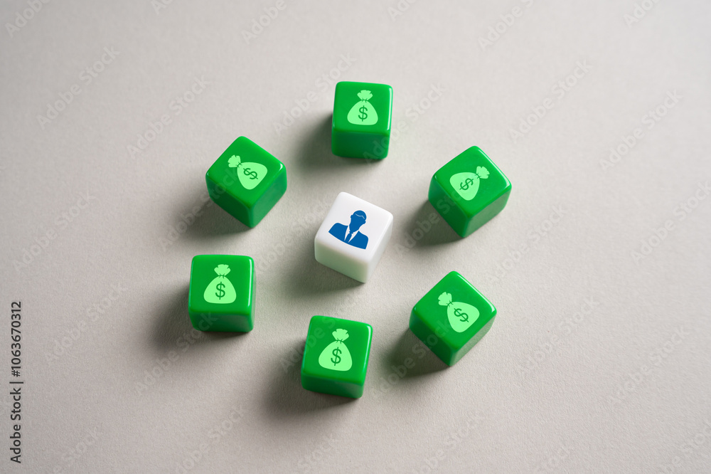 Businessman surrounded by money. Concept of earnings and financial success. Available contracts and orders. Job offers. Grants and bonuses. Investments and earnings.