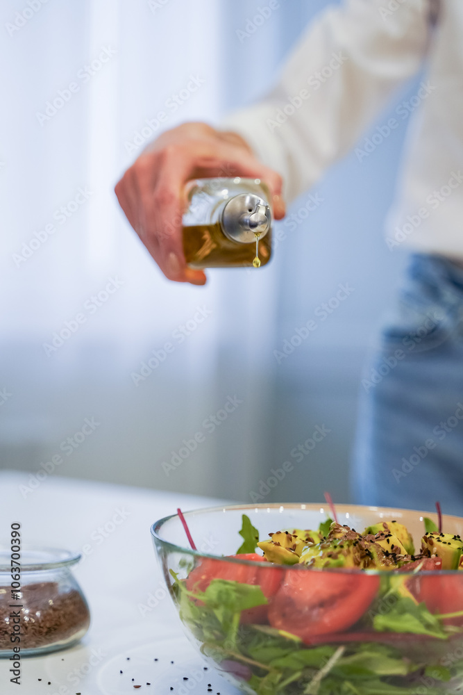 Bottle of healthy virgin olive oil pouring to salad bowl, close up