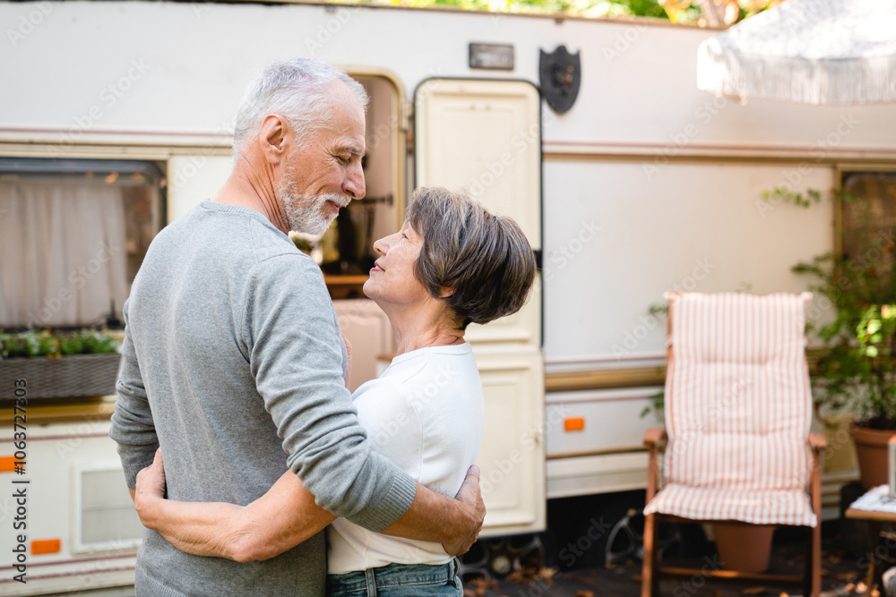 Cheerful husband and wife hugging embracing looking at each other with love and care while traveling