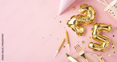Festive birthday setup featuring gold number balloons, decorative plates, cups, and party accessories on a pink background