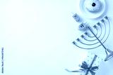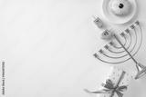 Festive Hanukkah scene featuring a golden menorah, traditional dreidels, jelly donut, and a wrapped gift with blue ribbon on a white background