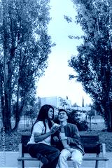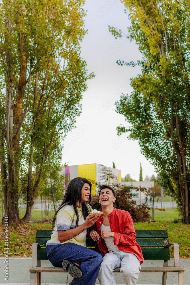 Happy latin transgender woman and her boyfriend laughing and eating a snack on a park bench
