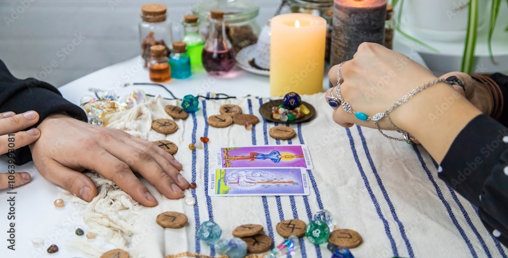 A woman fortuneteller tells a man on tarot cards. Selective focus.