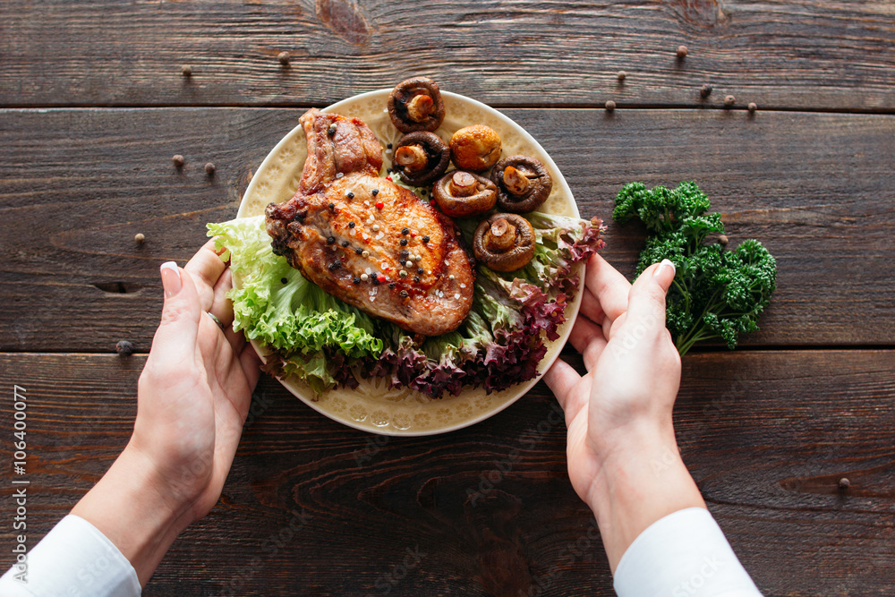 Waiter serving a chicken dish with lettuce and mushrooms. Chief decorating food for presentation in small cafe. Waiter presenting grilled chicken with salad for retail.