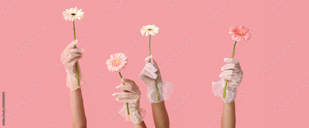 Female hands in laced gloves holding beautiful gerbera flowers on pink background