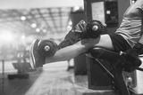 Man training legs in gym. Young man doing leg extensions on machine at the gym.