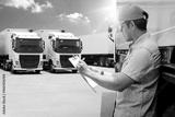 Truck Driver Holding Clipboard Inspecting Trailer Trucks. Semi Truck Tractor. Checks Truck Wheels and Tires. Maintenance Safety Checklist. Inspection Safety of Transport. Logistics Transportation.