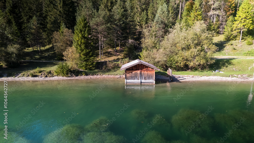 Panoramic view of Scenic Heiterwangersee lake in Austrian Alp mountains.
