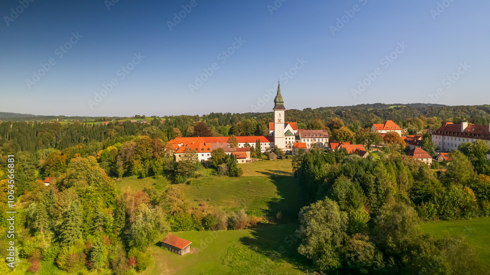 Aerial view of Rottenbuch, parish church Mariä Geburt in Germany.
