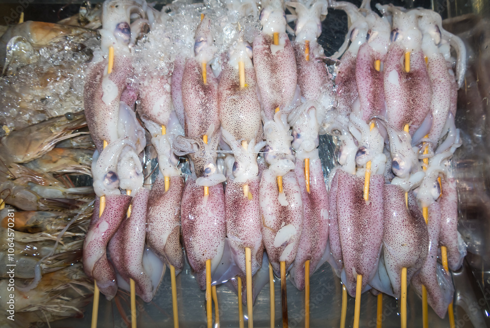 Raw seafood skewers including Squid and shrimp, Thai style street food.